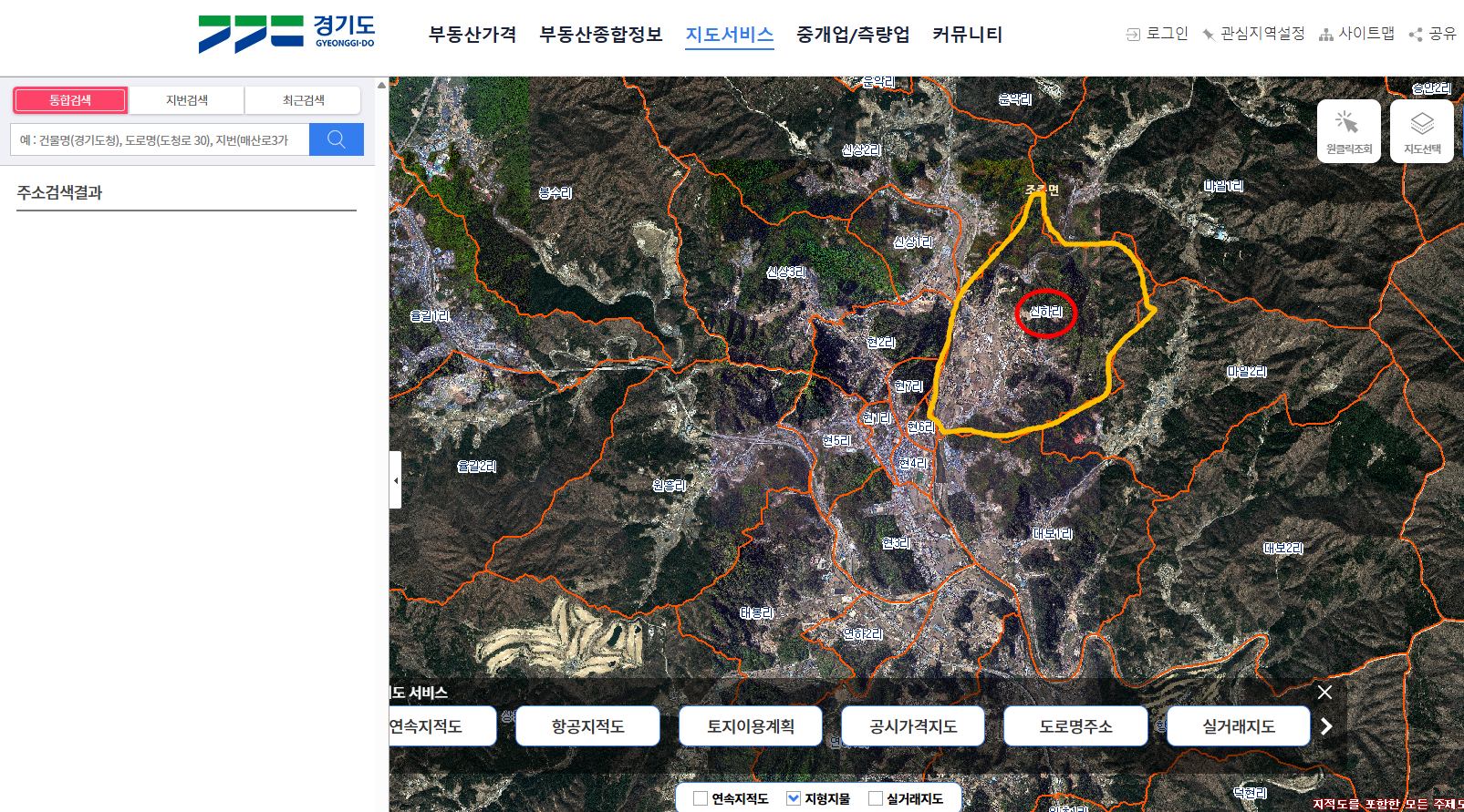 지도를 확대하거나 검색창에 주소를 입력해서 원하는 지역을 선택해줍니다. 화면에 보이는 주황색 선 구역은 통반리를 구분한 선입니다.