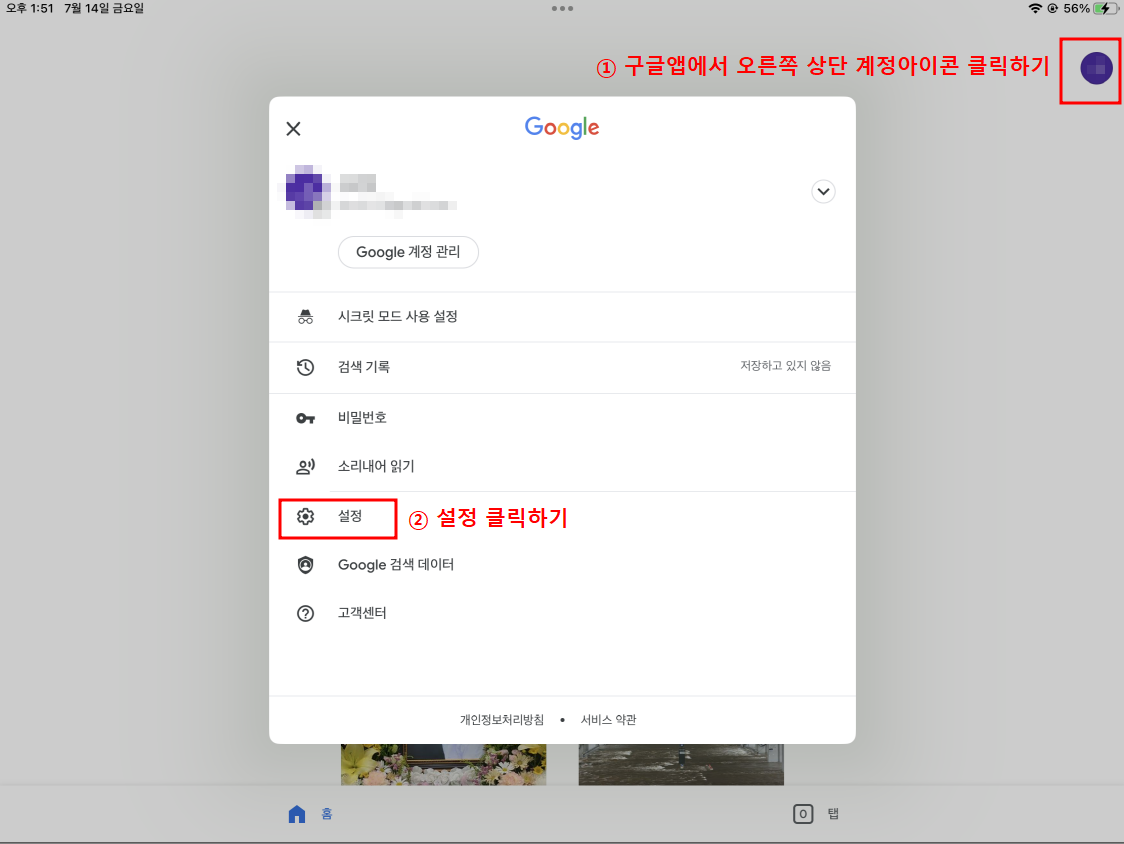 1. 구글앱에서 오른쪽 상단 계정아이콘 클릭하여 설정 들어가기