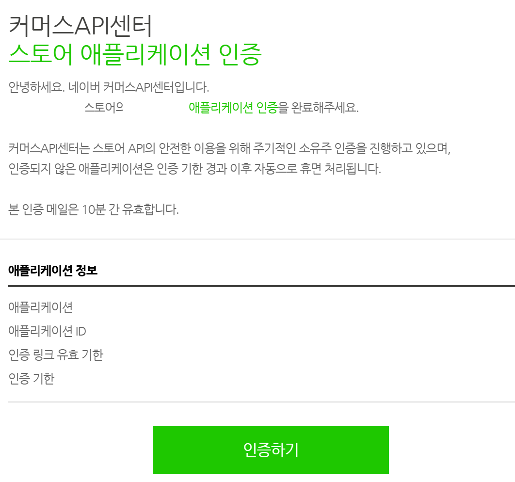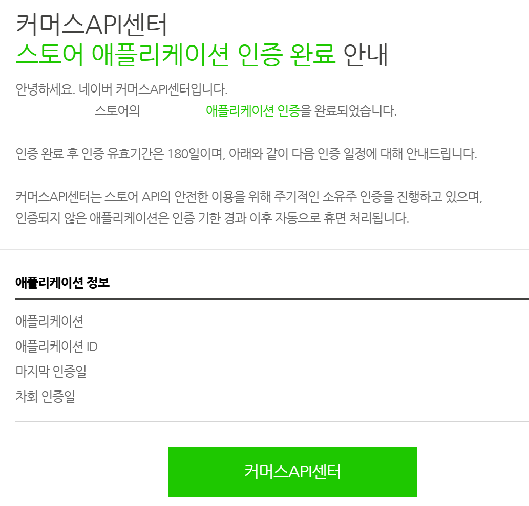 인증 경로: 커머스API센터 > 내 스토어 애플리케이션 > 애플리케이션 상세 페이지 오른쪽 상단 "인증" 버튼을 클릭하여 인증 진행