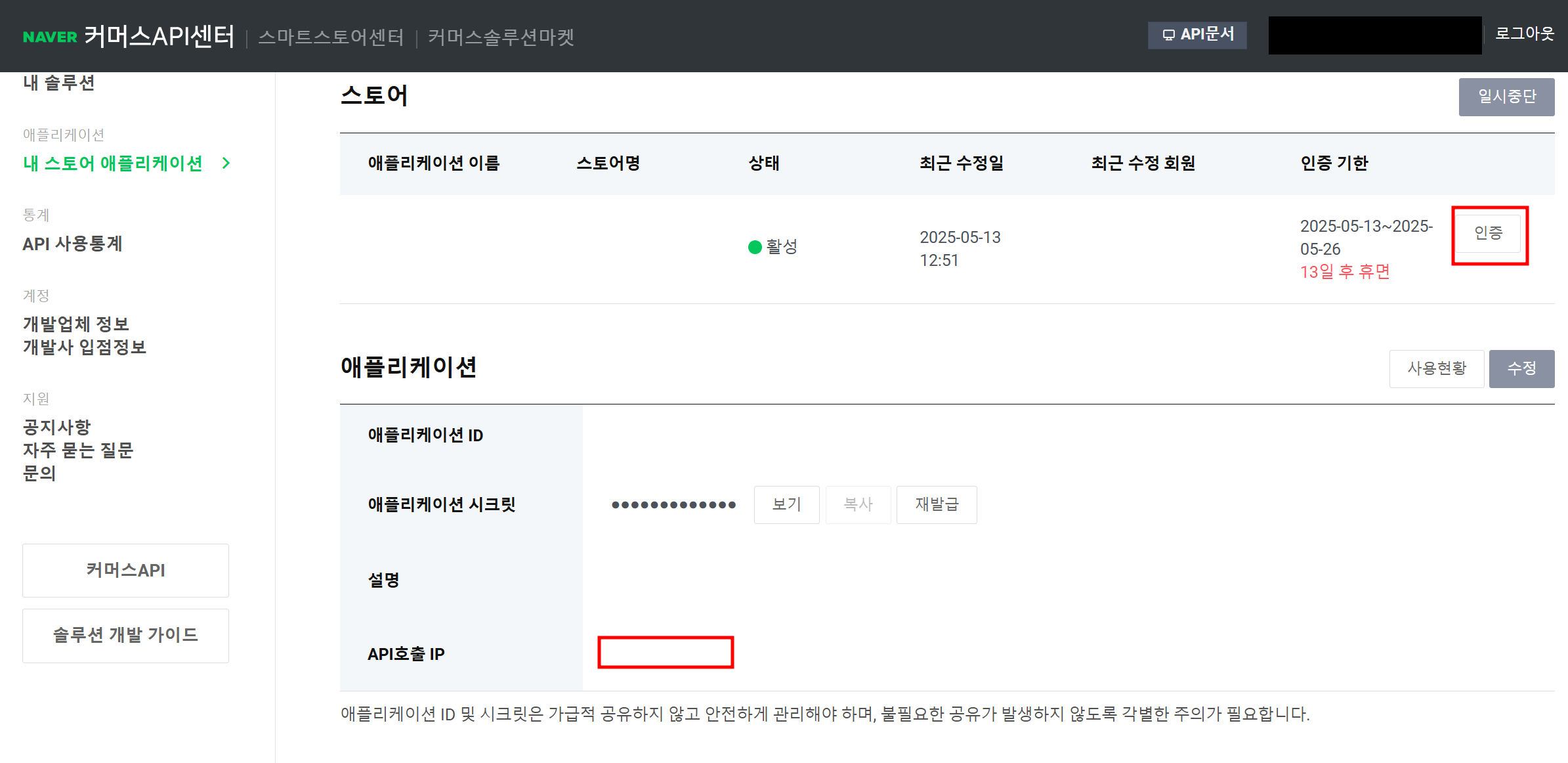 안녕하세요. 네이버 커머스API센터를 통해 스마트스토어 API를 사용하는 경우, 주기적인 스토어 애플리케이션 인증과 API 호출 IP 등록이 필수입니다. 아래 절차에 따라 설정해 주세요.