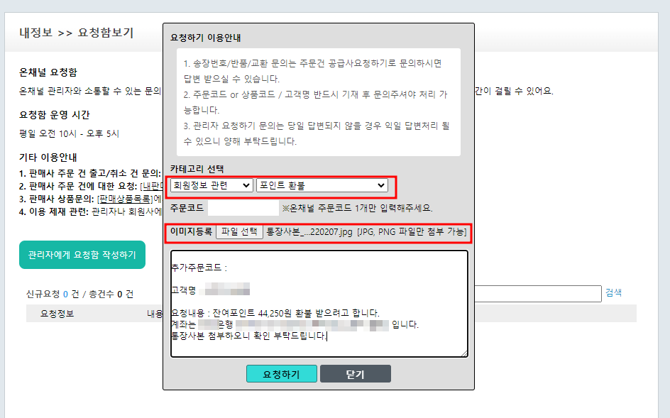 요청내용 : 잔여포인트 기재 및 계좌내용입력 후 요청하기