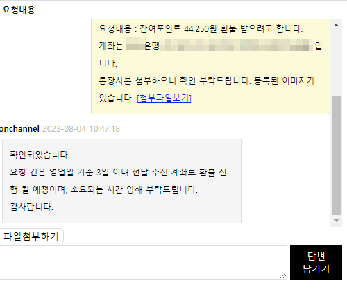 ※ 즉시 입금은 안되고 영업일 기준 3일 이내에 입금 처리 된다고 답변이 왔다.