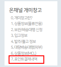 마이페이지에 들어가면 왼쪽에 카테고리들이 있는 온채널 개미창고 카테고리에서 7. 포인트 결제내역을 클릭해준다