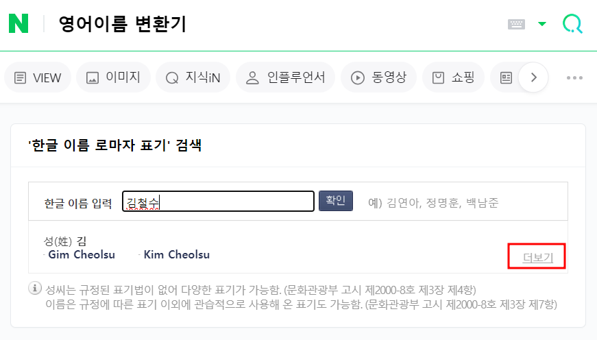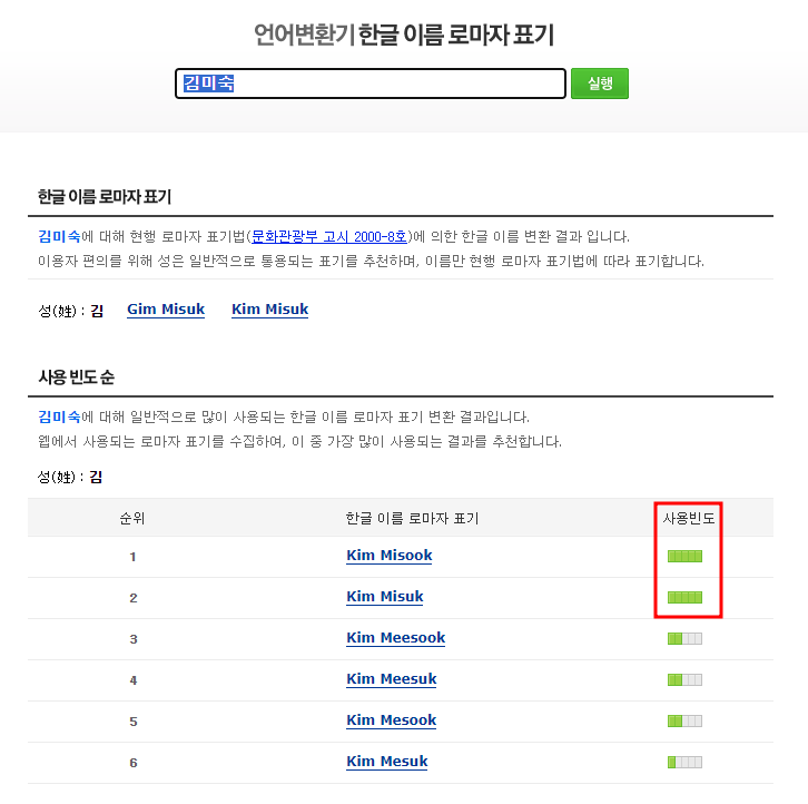 네이버 영어이름 변환기의 경우 더 보기를 클릭하면 다양한 영문이름이 나오고 어떠한 표기를 더 많이 사용하였는지 사용빈도를 통해 확인할 수 있습니다.