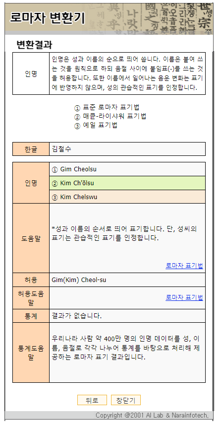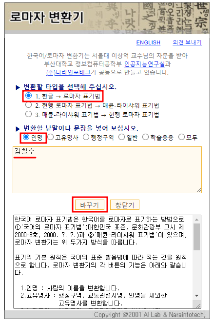 변환할 타입을 한글 로마자 표기법으로 선택하고 변환할 낱말이나 문장에는 인명을 선택하여 변환할 이름을 입력 후 바꾸기를 클릭하면 이름의 결과를 확인할 수 있습니다.