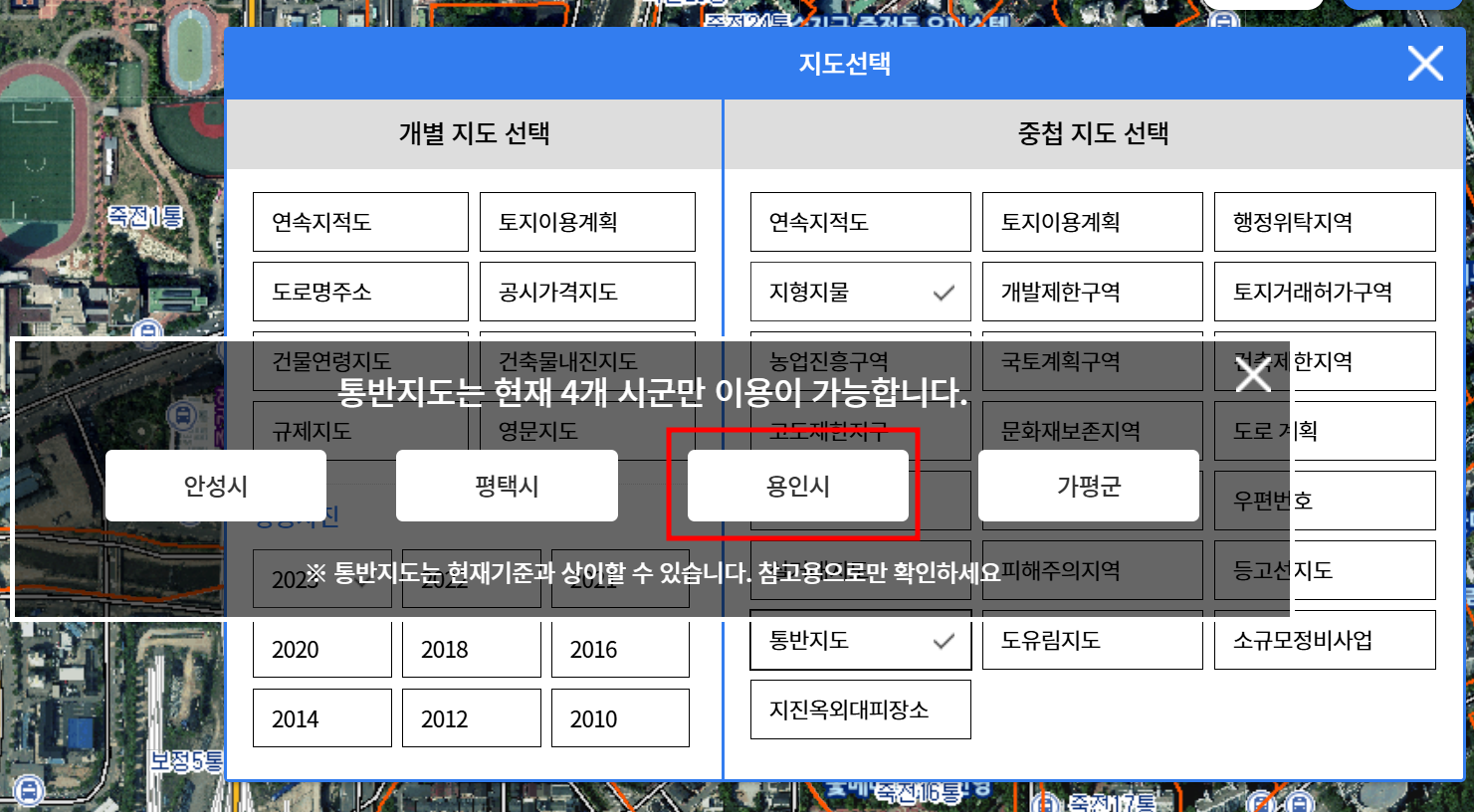 현재 안성시, 평택시, 용인시, 가평군 4개 시군에서만 통반지도를 확인할 수 있습니다.