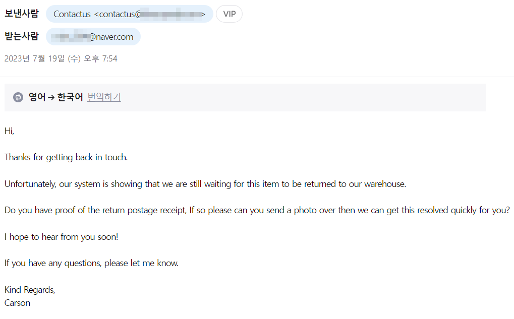 - 7/19 고객선터 답메일이 왔는데 반품 된 것을 확인 할 수 없다고 반품을 증빙할 수 있는 자료를 보내달라는 메일이 왔다.