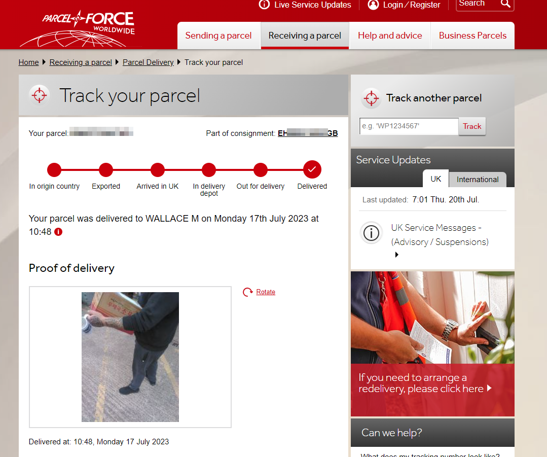 조회를 눌러주니 Royal Mail에서 Parcel Force 택배사로 연결되는 화면이 나왔다. 영국 우체국에서 배송업체에 하청 식으로 맡긴 듯하였다