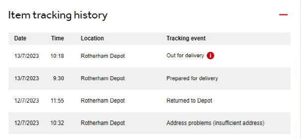 PARCEL FORCE 택배 조회 사이트로 전환되고 현재 Item tracking history를 확인할 수 있다. 내용을 보아하니 주소부족?으로 디포로 반환된 상황이었다. 화면 위쪽을 보면 Your parcel과 Part of consignment 라고 택배번호가 나오는데 오른쪽이 택배사 변경으로 영국 내 송장번호이고 왼쪽은 한국 EMS번호로도 나올 때도 있고 계속 조회하면 영국송장번호로 나올때도 있다(왜 송장이 왔다 갔다 하는지 모르겠다). 한국 EMS번호 하고 변경된 영국송장번호를 메모해 둬야 한다.