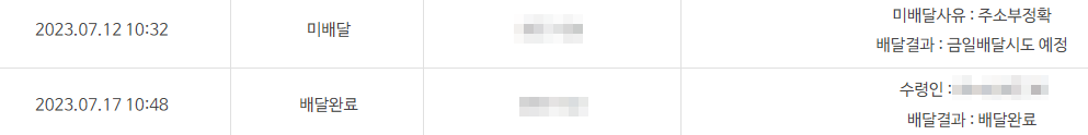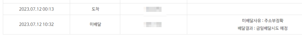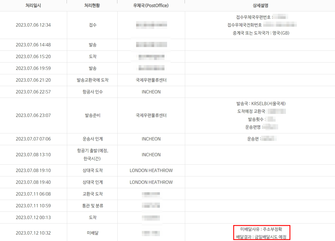 한국에서 택배조회는 오늘이 7월 17일인데 7월 12일 미배달까지 밖에 조회가 안된다. 가만히 있음 반송되고 나중에 행방조사청구까지 가야 하는 상황까지 올 수 있었다...