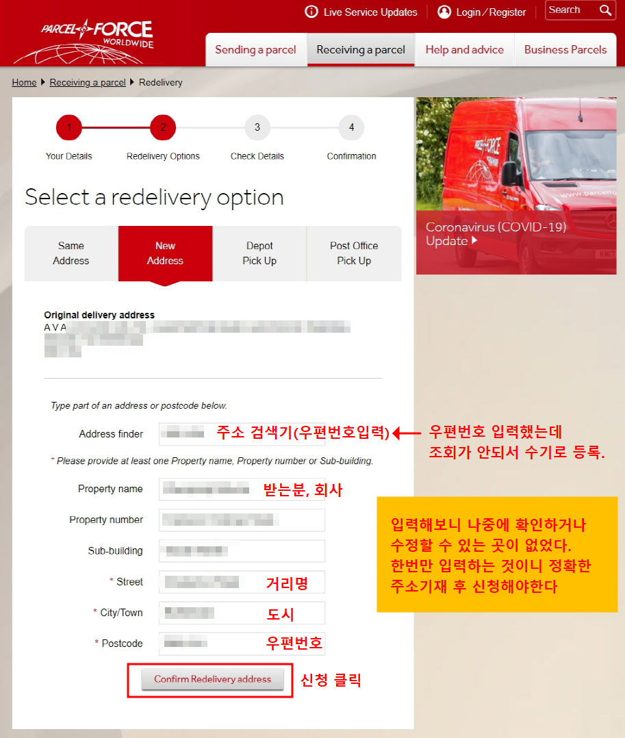 원래 발송하려던 곳 주소를 정확하게 기입하고 신청하면 된다. 오리지널 딜리버리 어드레스는 내가 신청한 곳이 아닌데 계속 떠있어서 화가 좀 났다. 일 제대로 하지 못하는.. 영국 우체국