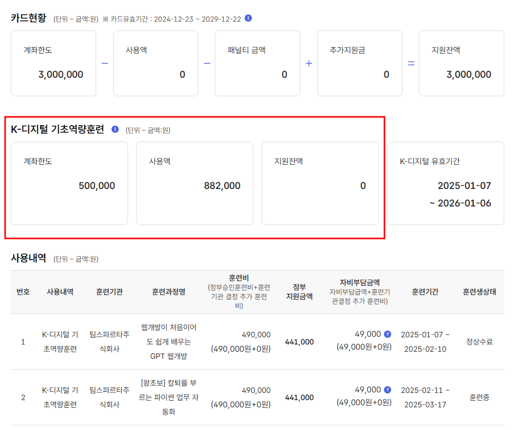 예를 들어, 제가 수강한 강의 훈련비가 49만 원이었고, 남은 1만 원으로 추가 강의(훈련비 한도 제한없음)를 신청할 수 있습니다. K-디지털 기초역량훈련의 계좌한도는 1년에 50만원이며 유효기간이 지나면 다시 계좌한도가 채워집니다. 저 같은 경우는 2025년 1월 7일 훈련을 시작하였기 때문에 1년이 내년 2026년 1월 7일 한도가 채워집니다. 이 방법은 예산을 최대한 활용할 수 있는 방법이므로 직접 학원을 가는게 어려운 분들은 참고하시면 좋습니다.