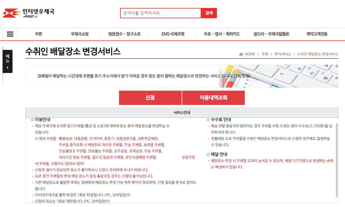 결론은 수취인 배달장소 변경서비스 라는 것을 신청하면 된다!!