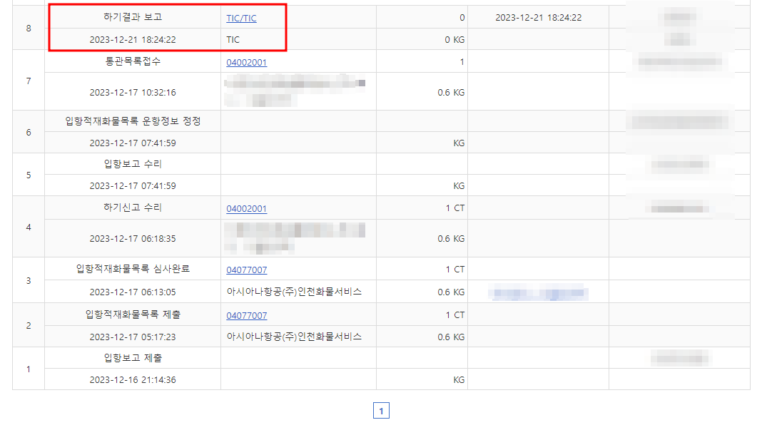 12/17 통관목록접수된 물건이 움직이지 않다가 12/21 하기결과 보고 TIC이 떴다.