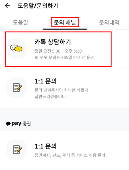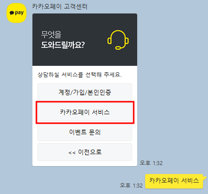 제일 빠른 방법은 카카오톡 카카오페이 고객센터로 문의하는 것이다.