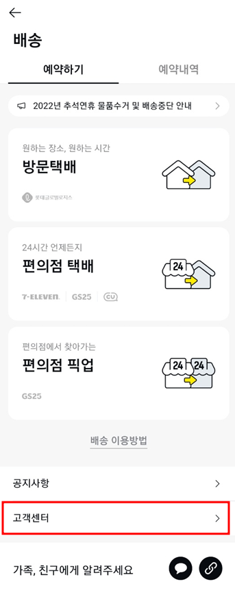 1. 카카오배송 신청화면 아래 고객센터 클릭