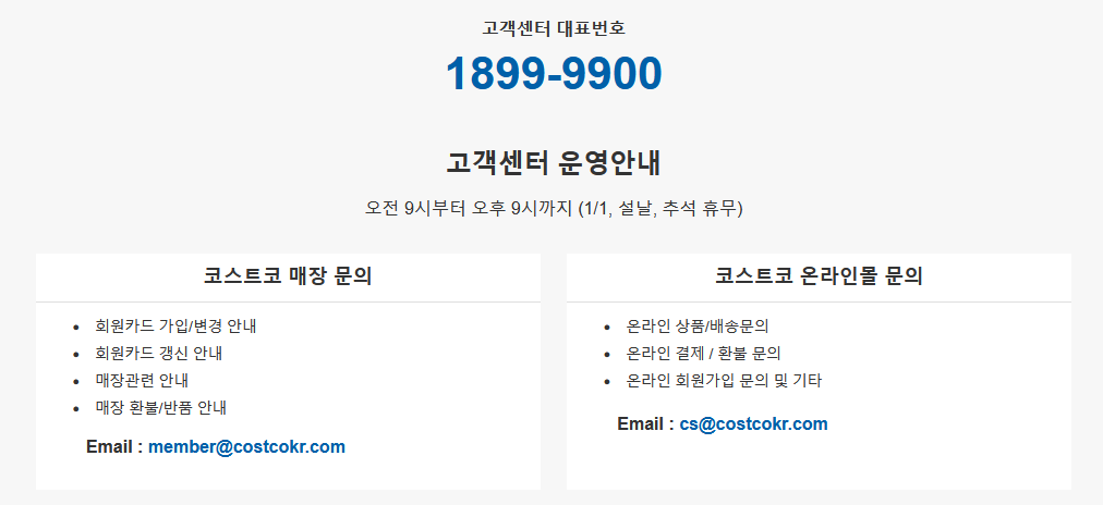 - 기타 문의 사항은 코스트코 멤버십 데스크 또는 고객센터(1899-9900)를 통해 확인할 수 있습니다.