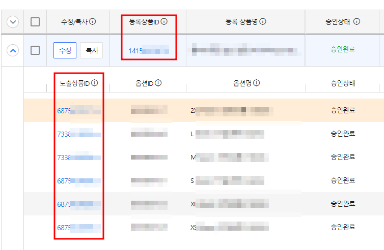 노출상품ID도 1개 생성, 옵선 ID는 옵션수 만큼 생성된다