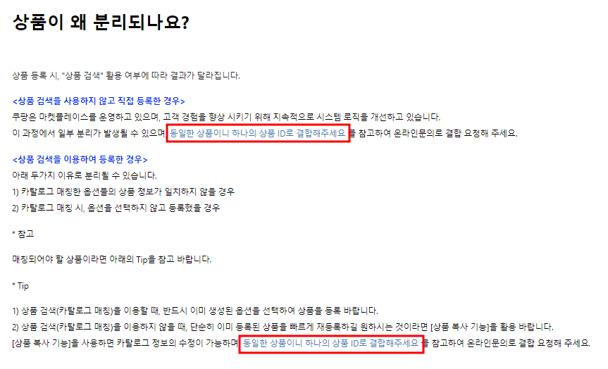 ※ 상품노출ID 다를때 쿠팡 온라인 문의에서 이유 및 방법 확인