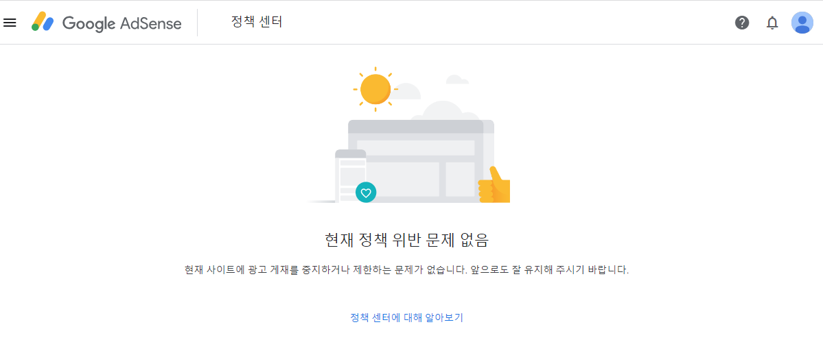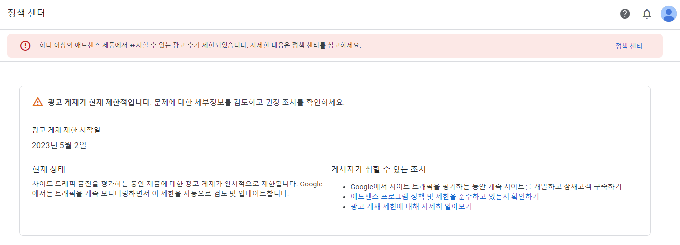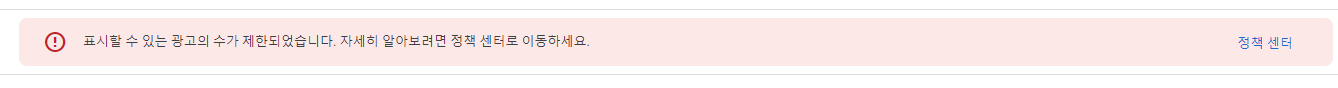 기존에는 "표시 할 수 있는 광고의 수가 제한되었습니다. 자세히 알아보려면 정책 센터로 이동하세요" 였는데..