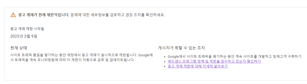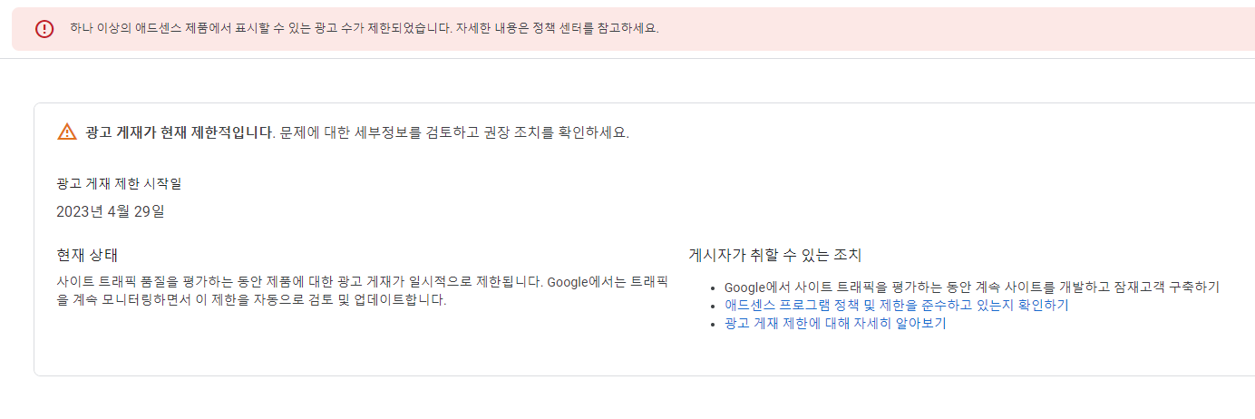 꾸준히 게시글도 작성해서 구글 애드센스 제한이 풀리길 기다리는 수밖에 없네