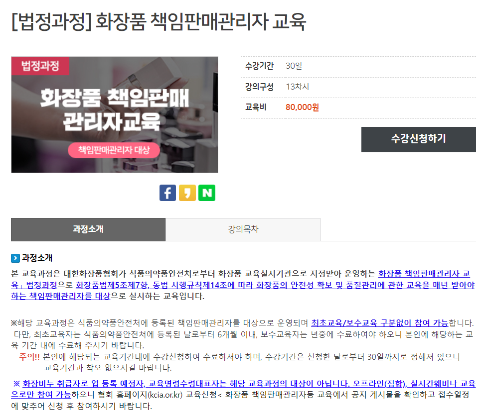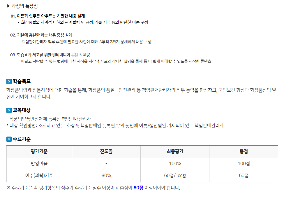 작년에 실시간 교육을 들었던 분 들하고 얘기를 하면 교육에 나왔던 내용인데 모르는 분들도 많더라고요. 부업하시는 분들이 회사에서 듣거나 틀어놓고 보셨다는 분들이 많았다고 들었습니다. 사실상 교육이 목적이 아니라 수강완료하는 것이 목적이 되어버려 교육의 의미를 잃어버리지 않았나 싶었습니다. 잘못 알고 화장품 판매 시 문제가 생길 수 있게 때문에 전반적인 사항은 판매자분들은 꼭 확인하셔야 합니다.