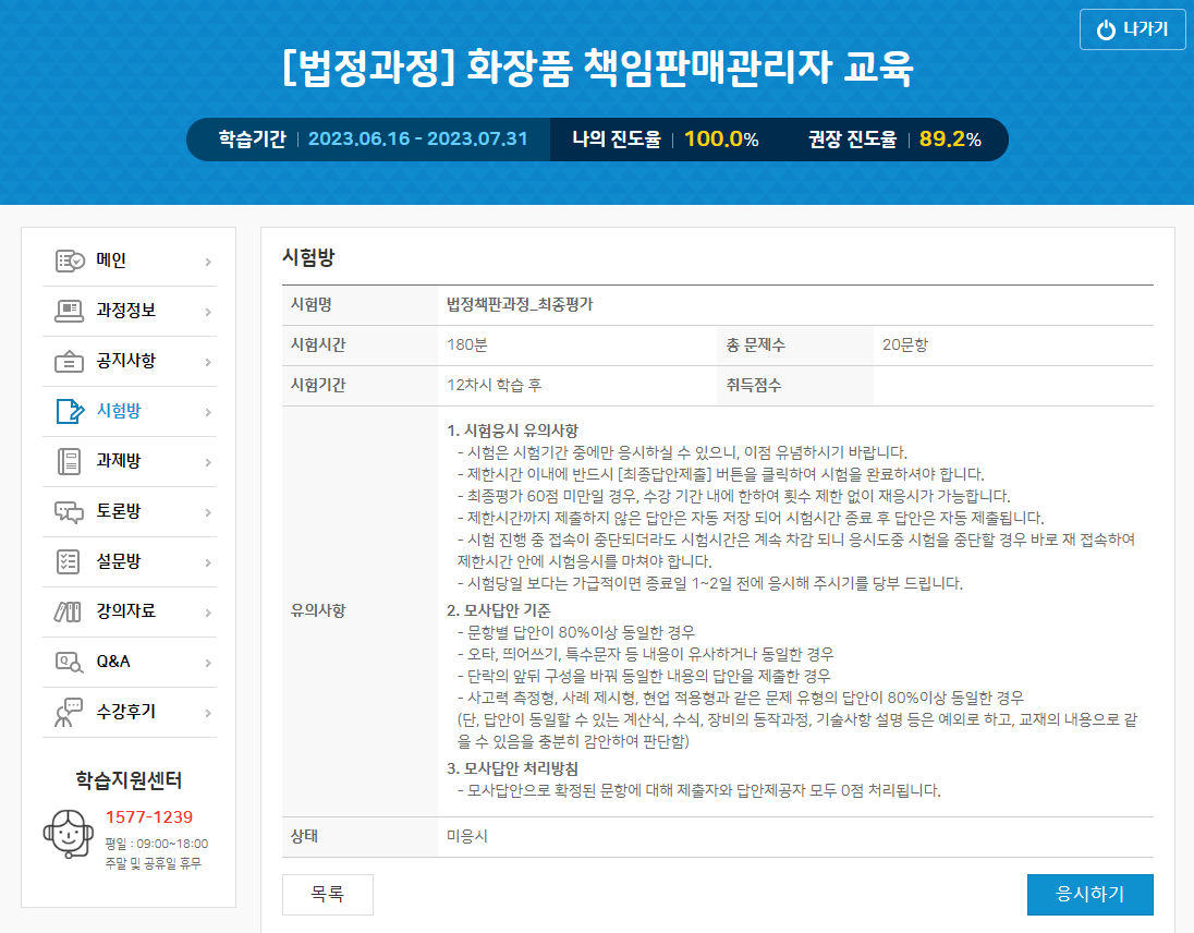 아래는 화장품 책임판매관리자 온라인 동영상 교육 수강 화면입니다.